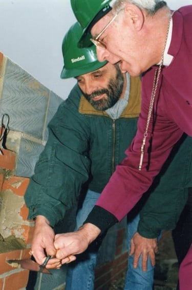 Derek Fiddament and the Bishop of Norwich laying the stone together